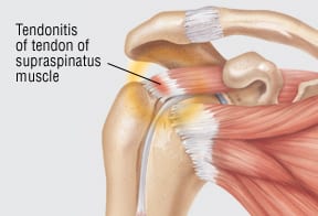 Tendonitis in the shoulder – The most common form of tendonitis in the shoulder is rotator cuff tendonitis. It involves the tendon of the supraspinatus muscle, which attaches to the upper portion of the upper arm bone (humerus) at the shoulder joint. Less commonly, the tendon of the infraspinatus muscle or other tendons of the rotator cuff is affected. In most cases, the supraspinatus tendon is injured by overuse, typically in an occupation or sport that requires the arm to be elevated repeatedly. People at risk include carpenters, painters, welders, swimmers, tennis players and baseball players. The average patient is a male laborer older than 40, and the shoulder pain is on the same side as his dominant hand (for example, right shoulder pain in a right-handed person).