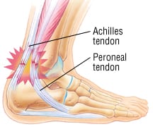 Achilles tendonitis – This form of tendonitis affects the Achilles tendon, the large ropelike tendon attached to the heel bone at the back of the foot. Achilles tendonitis usually is caused by overuse, especially in sports that require running or repeated jumping, and it accounts for 15% of all running injuries. Achilles tendonitis also may be related to faulty running technique or to poorly fitting shoes, if the back of the shoe digs into the Achilles tendon above the heel. Less often, Achilles tendonitis is related to an inflammatory illness, such as ankylosing spondylitis, reactive arthritis, gout or rheumatoid arthritis.